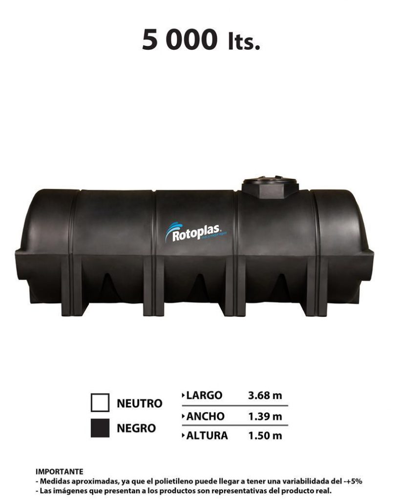 Es un tanque de polietileno muy resistente grado alimenticio que sirve para transportar mediante un remolque o a fin agua, fertilizantes, alimento, naftas u otra sustancia. Capacidad de 5,000 litros con reforzamiento y protección solar, además es ideal para la intemperie por ejemplo en zonas de campo o agroindustria.